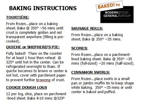 We offer a number of our delicious bakery items for you to bake at home. These are RTB (ready to bake), frozen and can be purchased during our regular hours. We provide these baking instructions for a number of the products and often have more choices in-store. Fill your home with the aroma of a bakery!